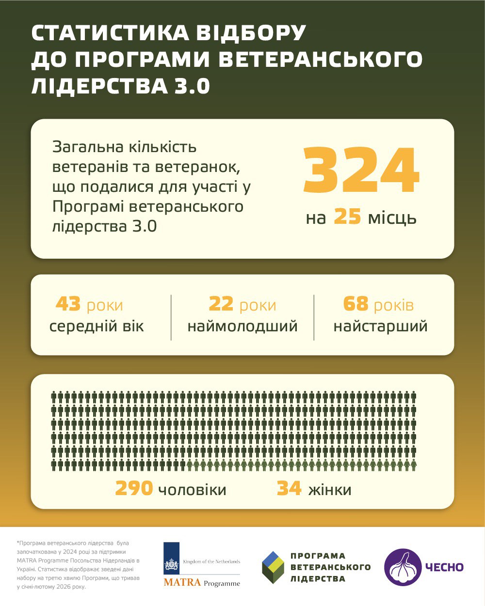 Цьогоріч до участі у відборі подалися ветерани та ветеранки різних вікових категорій. Наймолодшому апліканту наразі 22 роки, а найстаршому 68 років. Середній вік – 43 роки. Понад 10% учасників відбору – жінки, що мають ветеранський досвід. Цей показник також є найвищим серед попередніх хвиль відбору.